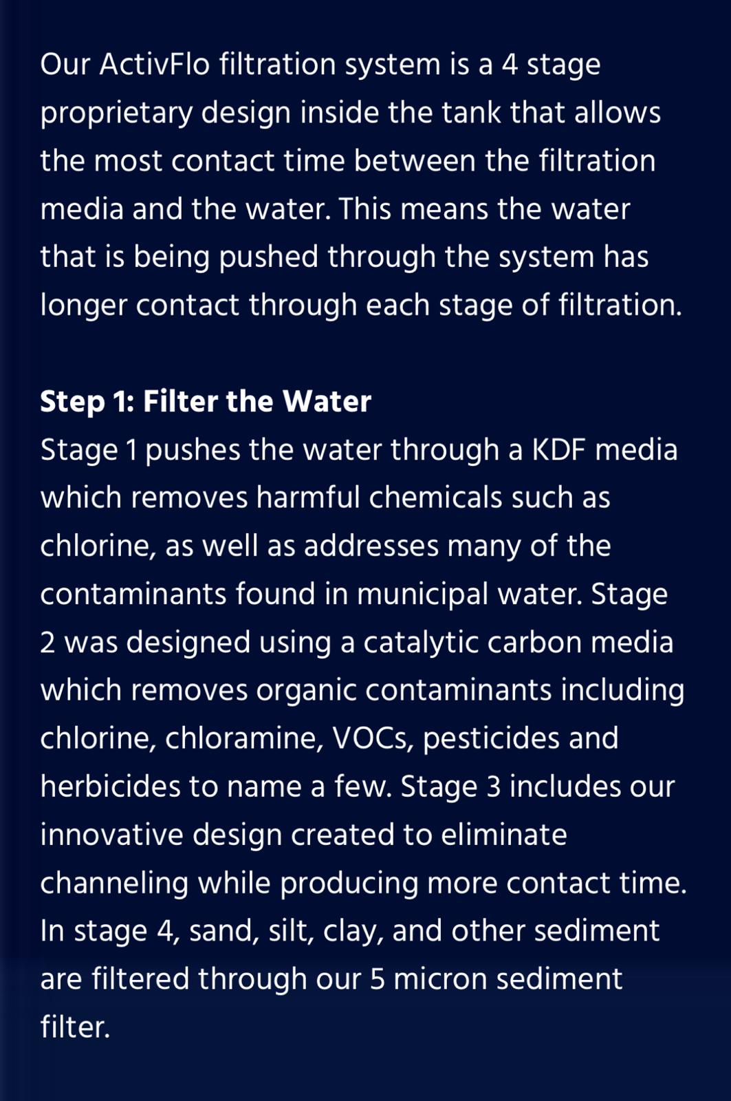 Our Activlo filtration system is a 4 stage proprietary design inside the tank that allows the most contact time between the filtration media and the water. This means the water that is being pushed through the system has longer contact through each stage of filtration.